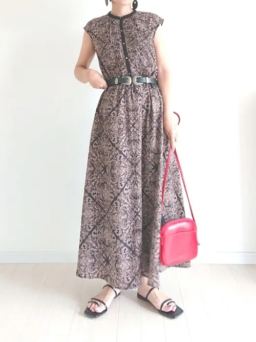 用显眼度MAX的全花纹连衣裙,打造亚洲风格的搭配。别忘了用腰带束紧腰部,凸显腰线轮廓。