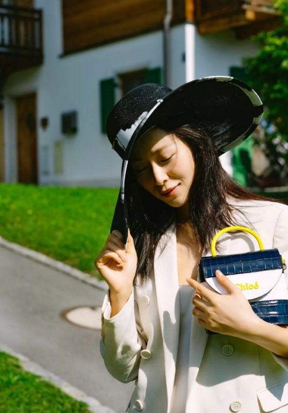 配件的选择可以最好地反映时尚设计。姜一燕选择了深黑色的沙滩遮阳板。宽大的帽檐使脸部变小,并带有美丽的笑容,似乎能够使所有人陶醉。这种色调选择与服装形成了中性,和谐的时尚。手握的多色组合包充分展现了小女人的魅力。