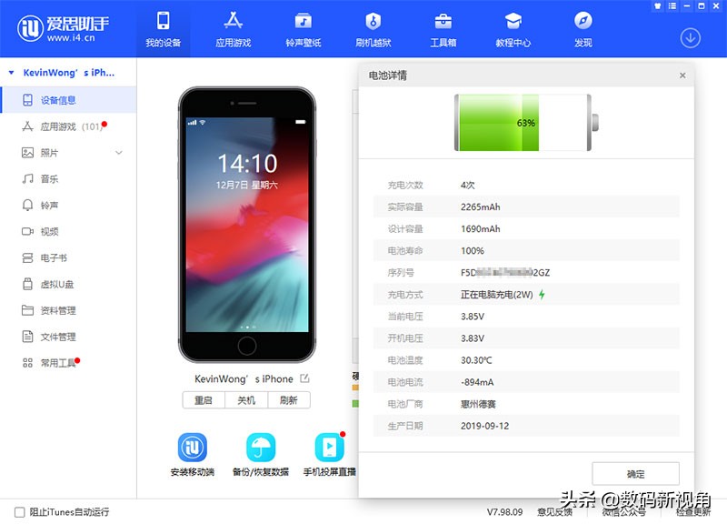 重度使用两天后上爱思检测,检测显示更换过电池,电池容量2265mA上,比官方宣称的数据2230mAh还要高些,显示电池的厂商是惠州德赛。